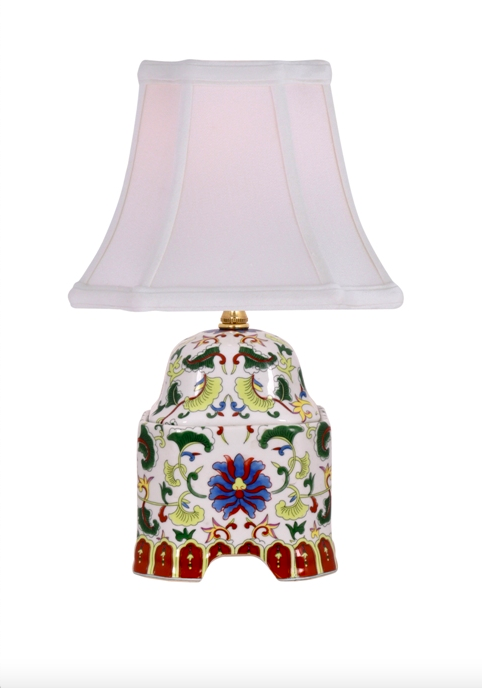PORCELAIN FLORAL SQUARE JAR LAMP 15.5″ HIGH 9″ WIDE LAMP BODY HEIGHT: 7″ LAMP BASE WIDTH AND DEPTH: 5.5″ X5.5″ IN LINE FLIP SWITCH MAXIMUM 40W LED SOFT SHADE 5X9X7″ OFF WHITE