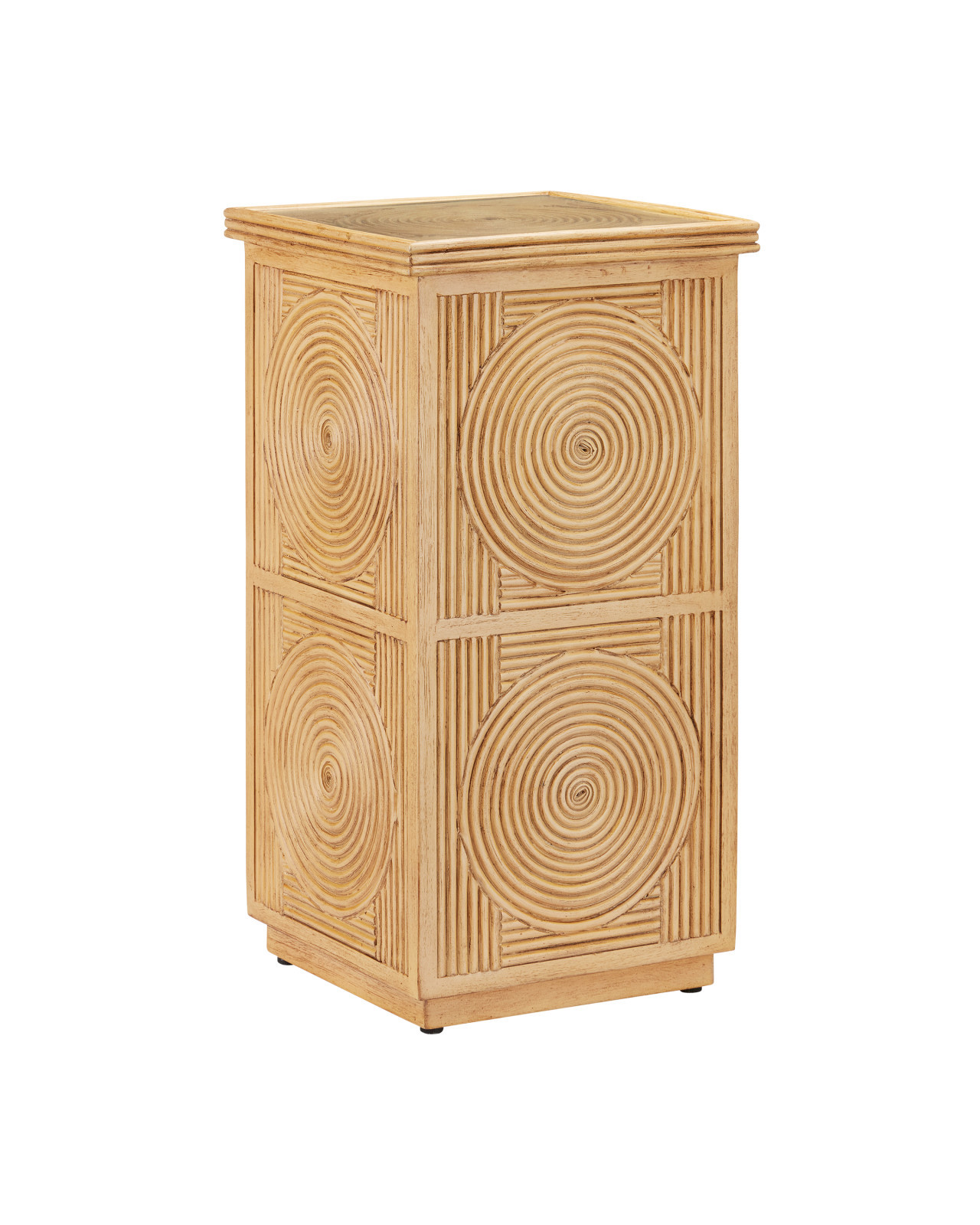 The Santos Sea Sand Accent Table has a split rattan pattern on each of its four sides and on the top — the pieces applied by hand to a solid mahogany body. Then a Sea Sand finish is applied to the entire piece. A design detail of note is how the circular patterns intersect with the horizontal and vertical lines.